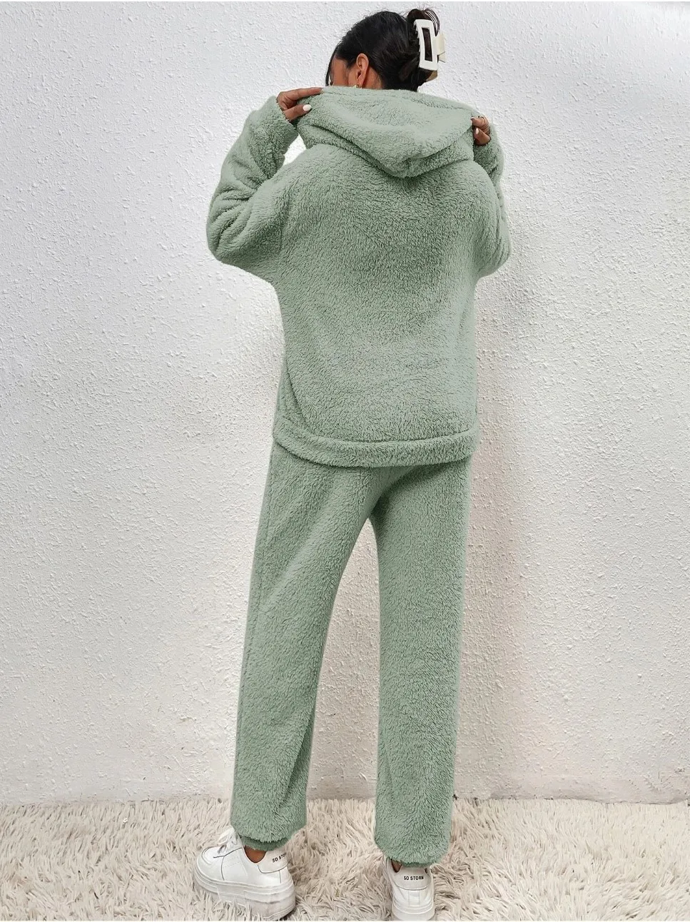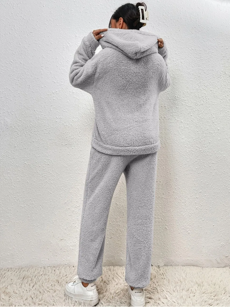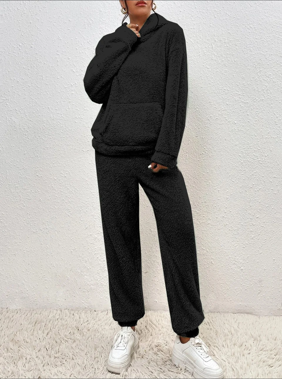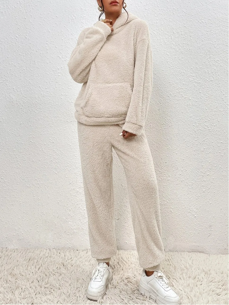 Autumn Winter Fashion Women Casual Hooded Sweatshirt Leg Pants 2 Piece Set Warm Furry Plush Trousers Suit Female Outfit