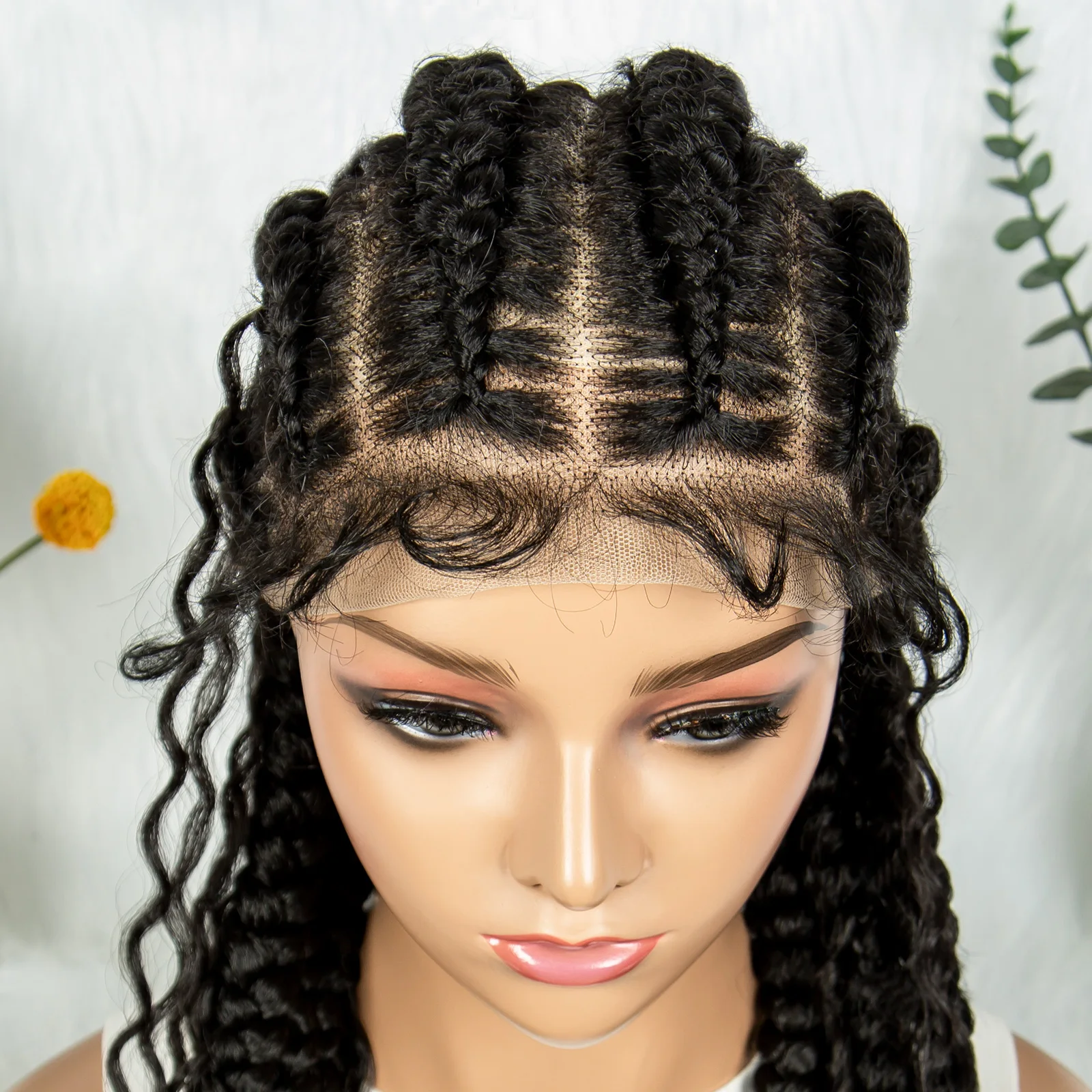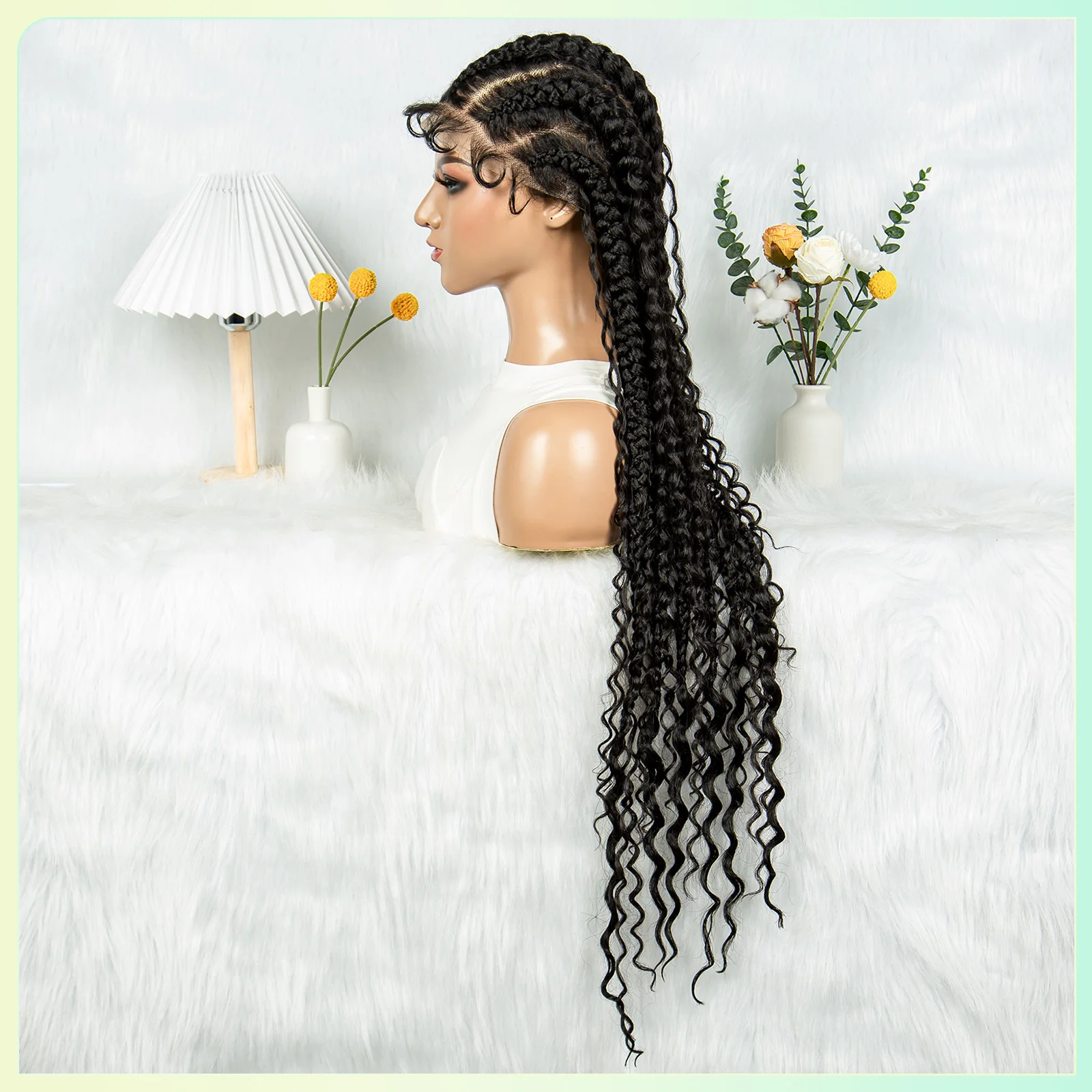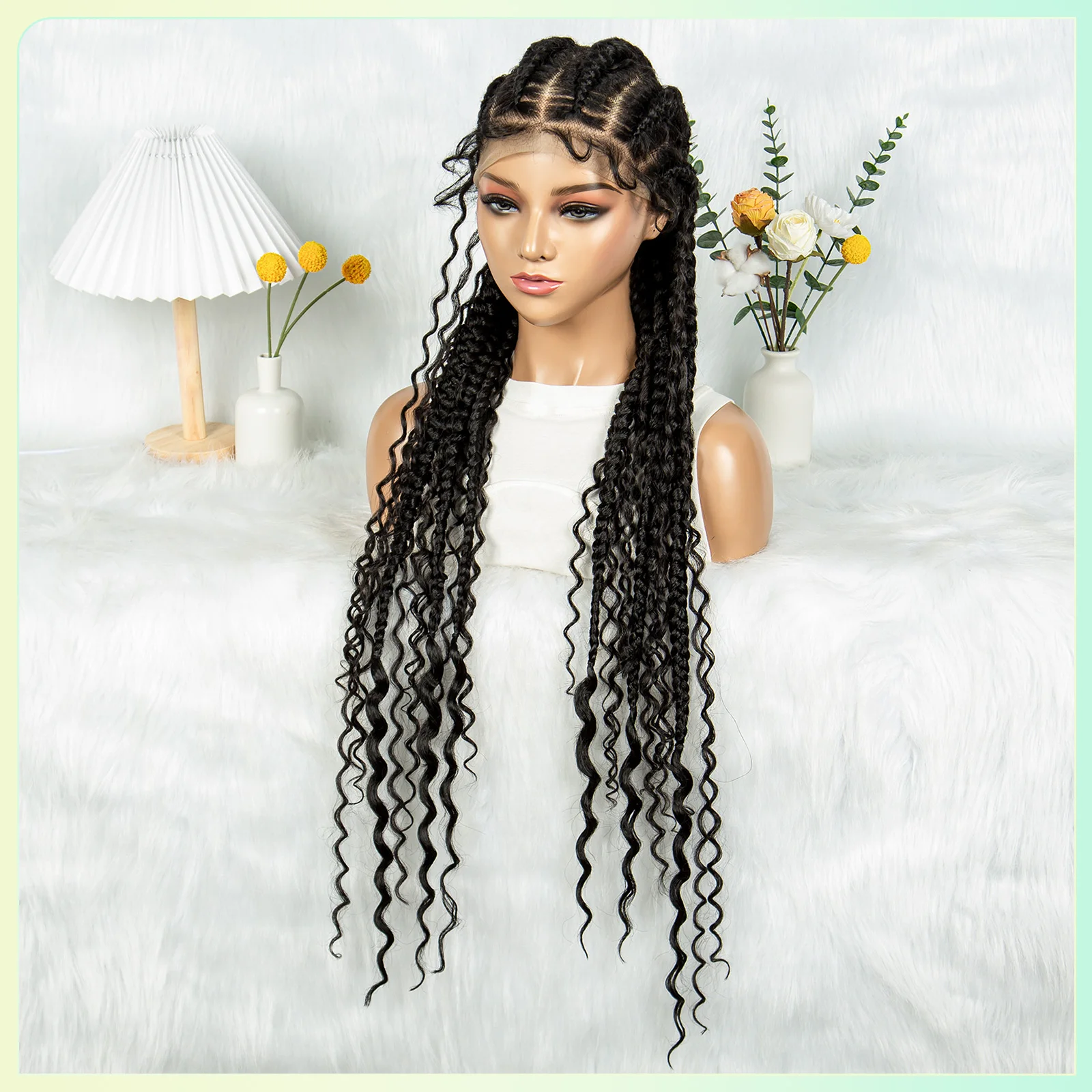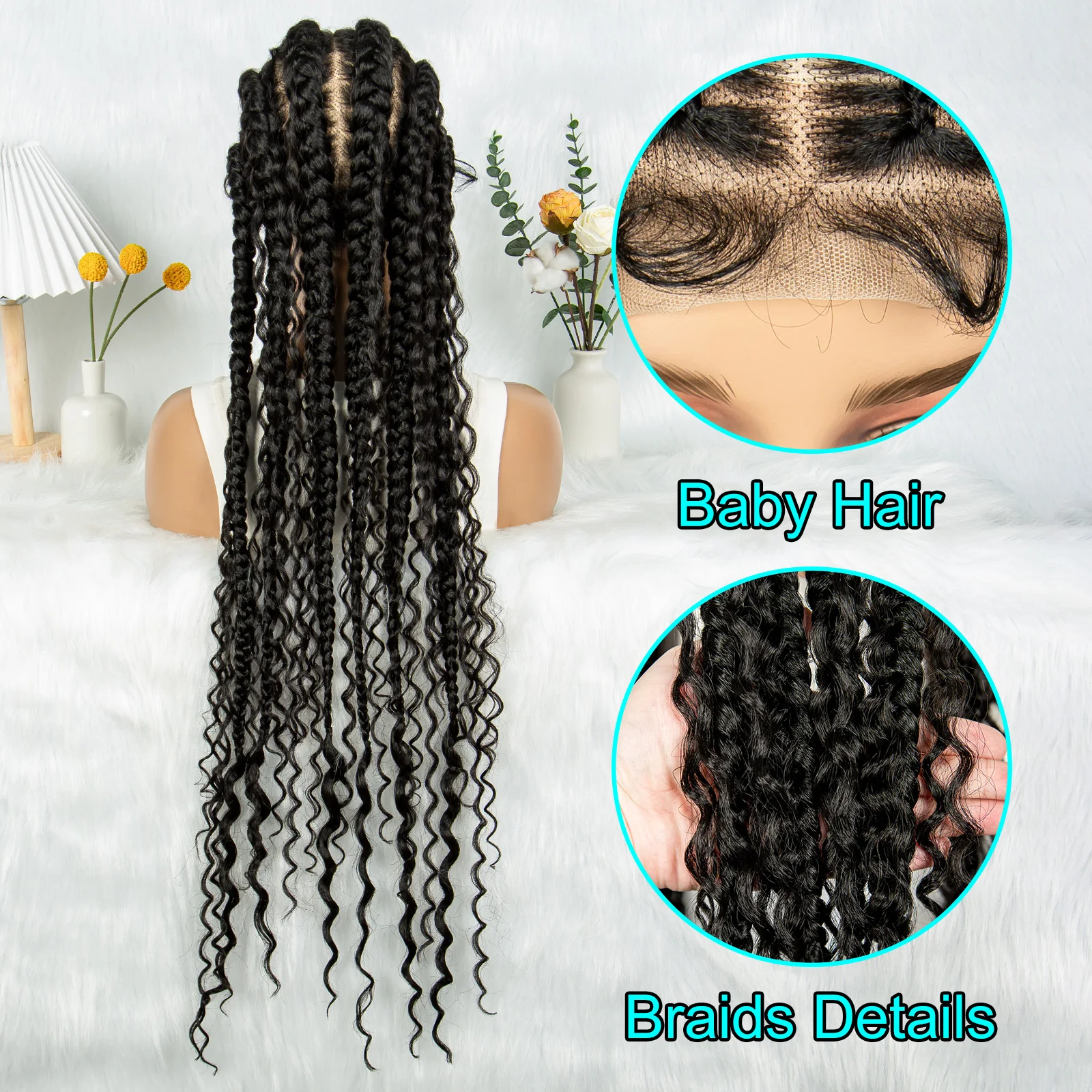 Cornrow Braided Wigs with Curly Ends Knotless Lace Frontal Braids Wig Synthetic Full Lace Braided Wigs with Baby Hair for Women