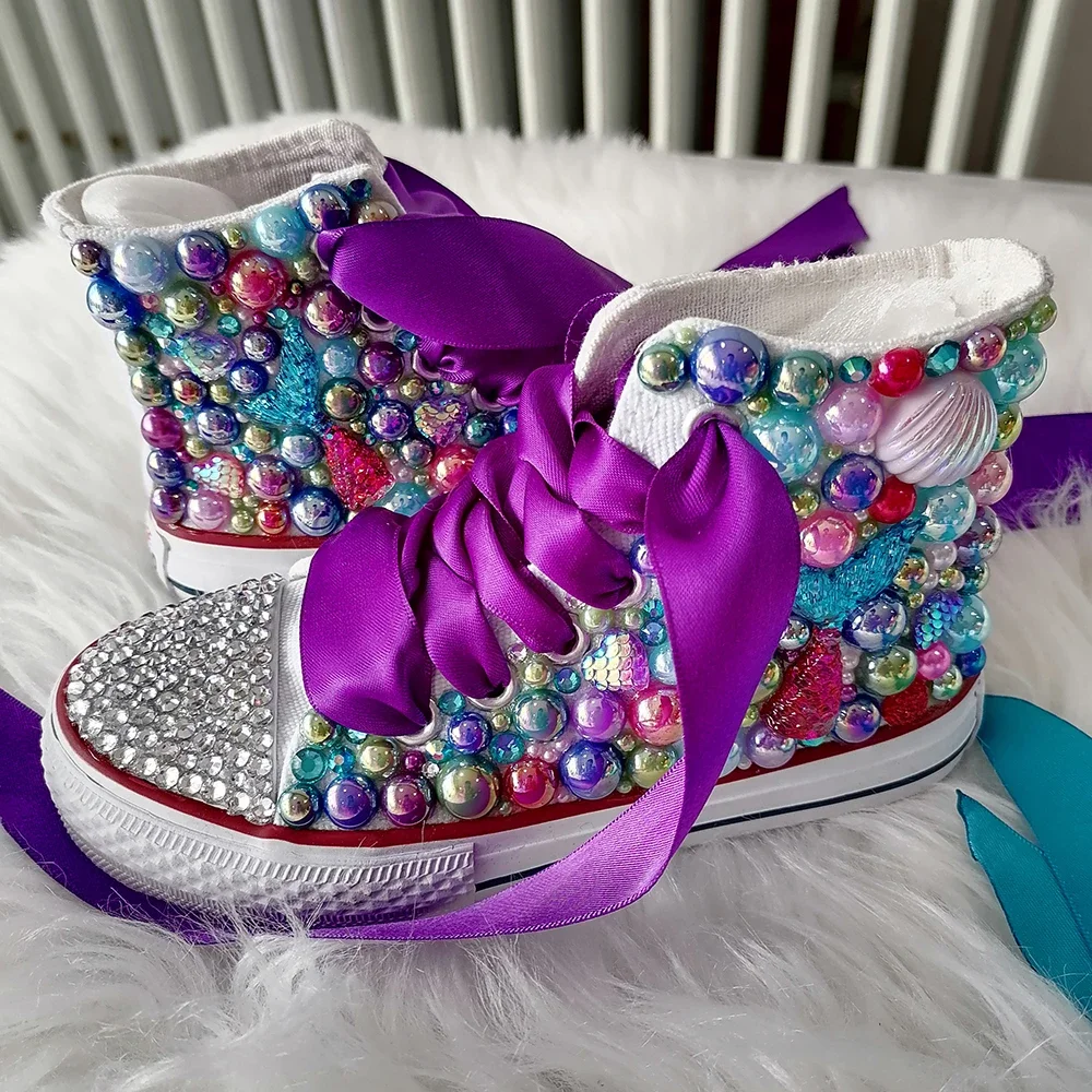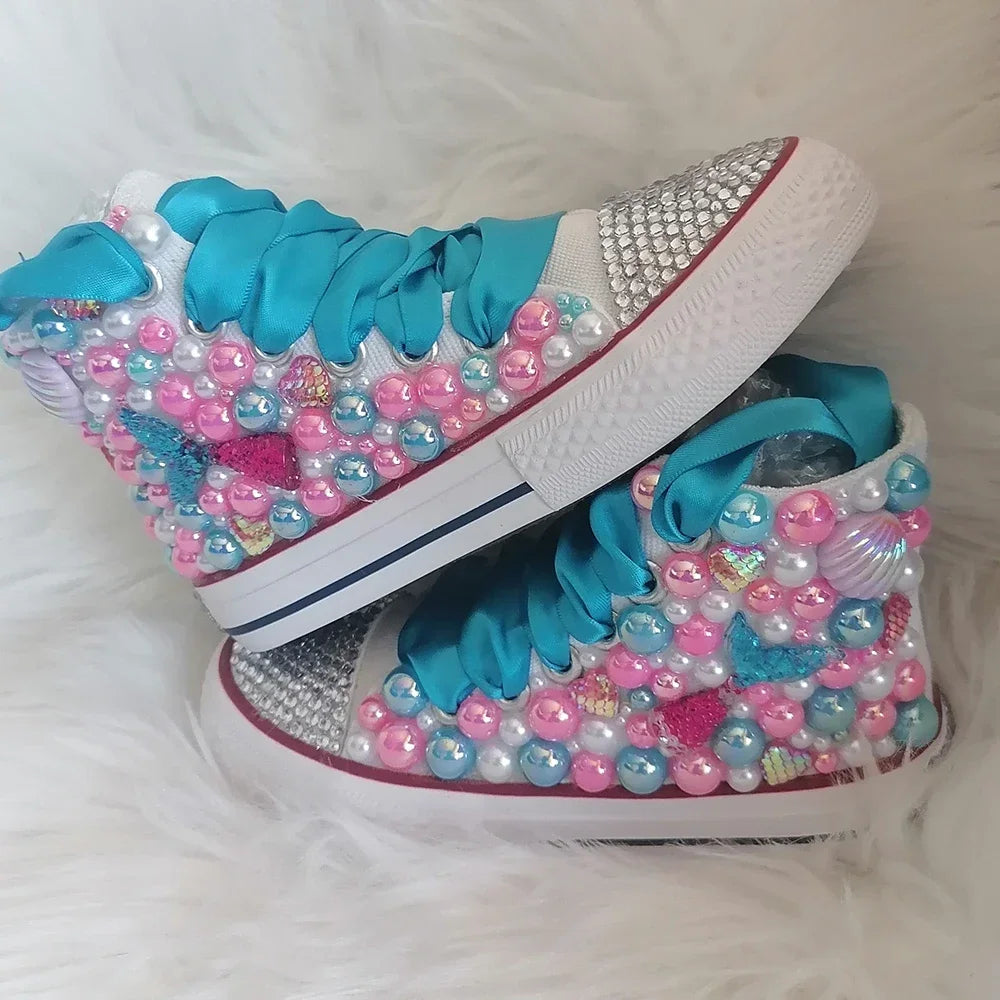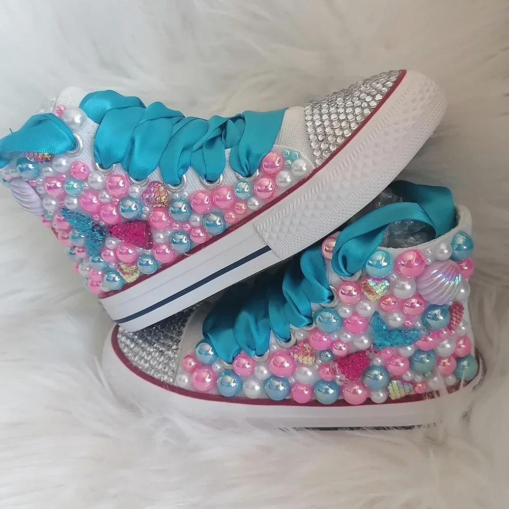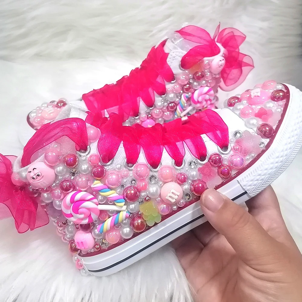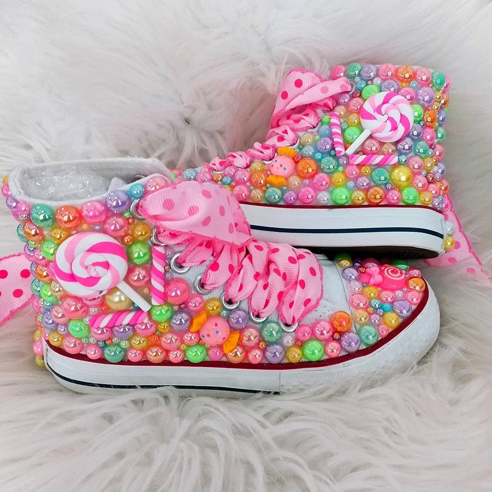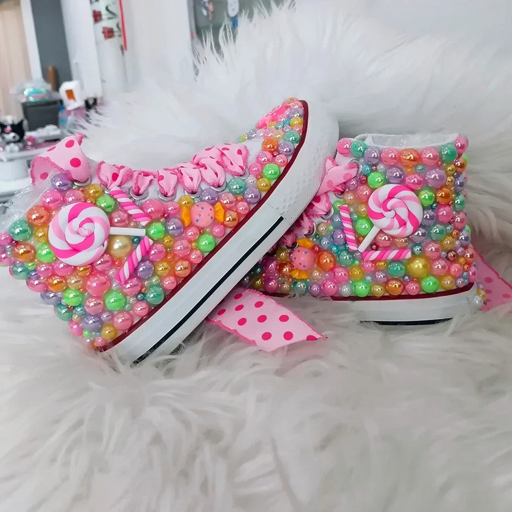 Handmade Rhinestones Bling Girls Womens Kids And Mother Candy Canvas Shoes Pearls Sneakers For Girl Birthday Party Wedding