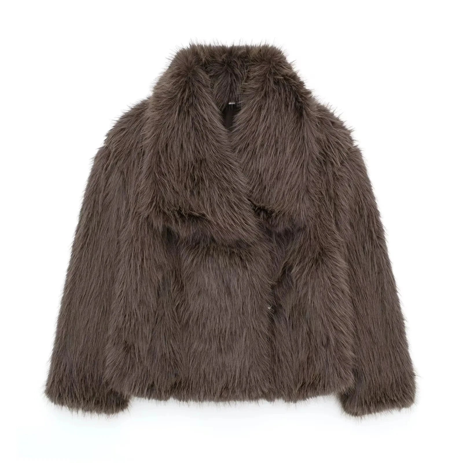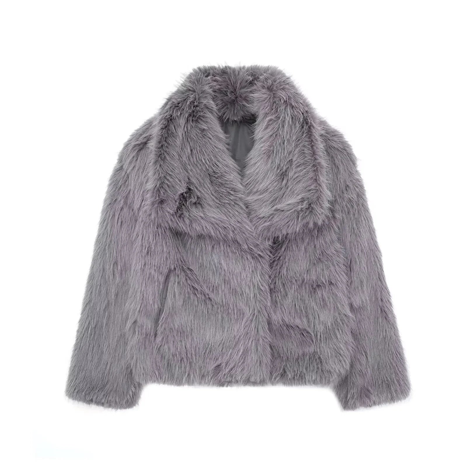 HH Winter Female Street Fashion Warm Coats Long Sleeves Hidden Buttons Lapel Plush Casual Artificial Fur Effect Retro Coat