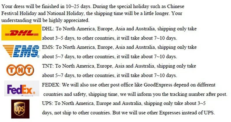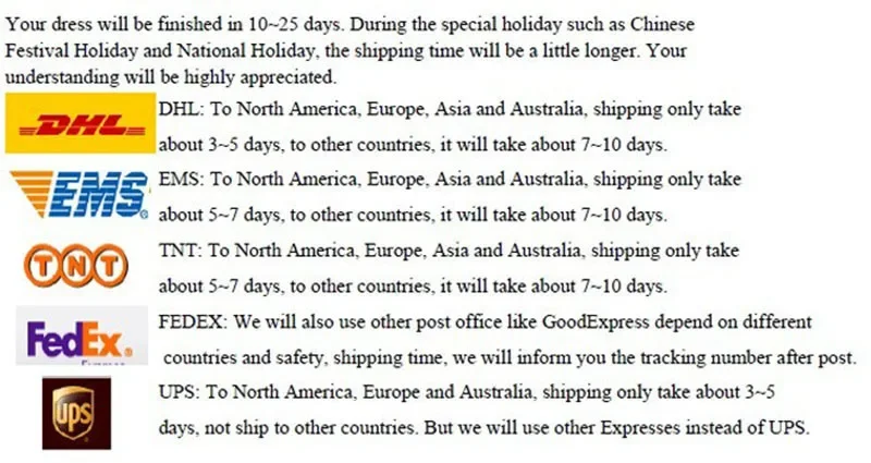 Note: 1.For rush delivery.If you need the dress less than 7 or 15 days. Please note us the date you need the dress, we will put your order on prior schedule and make sure you receive it on time. 2.For some styles with complicate beading and hand work, it may take few more days for processing.