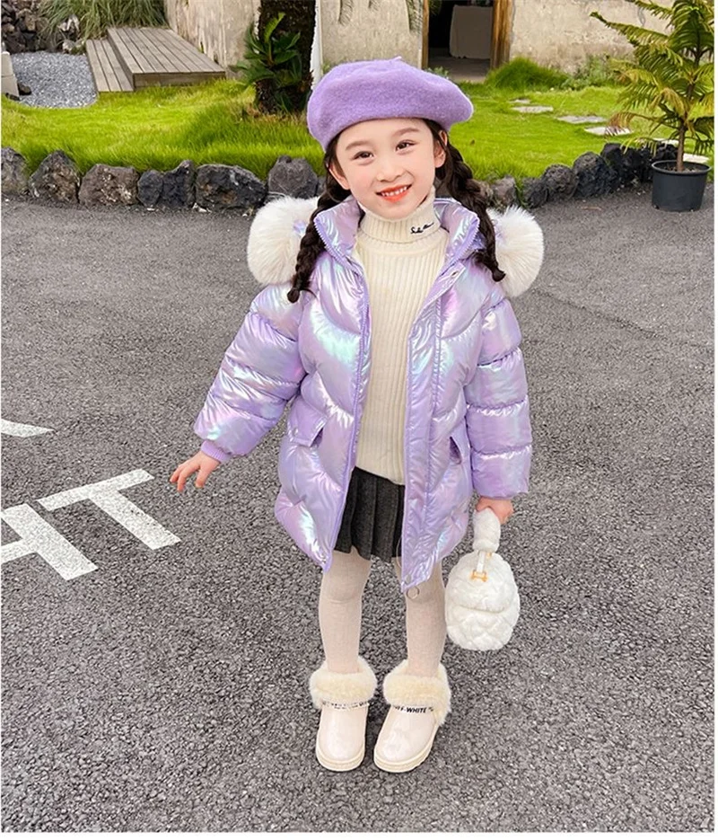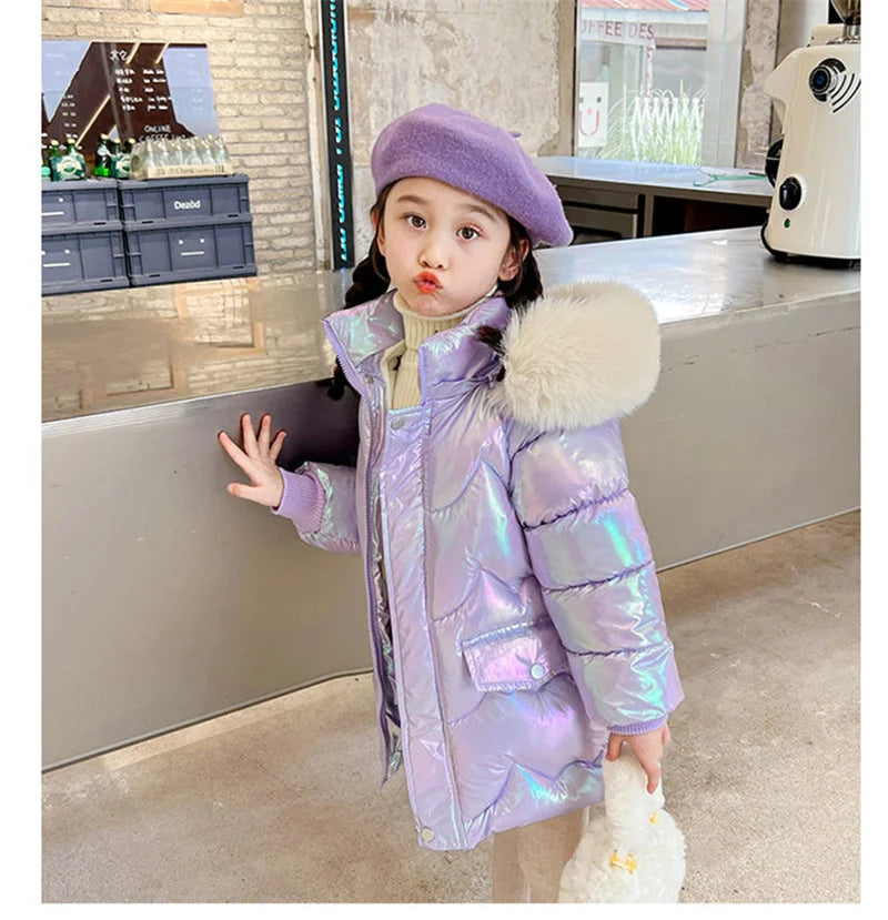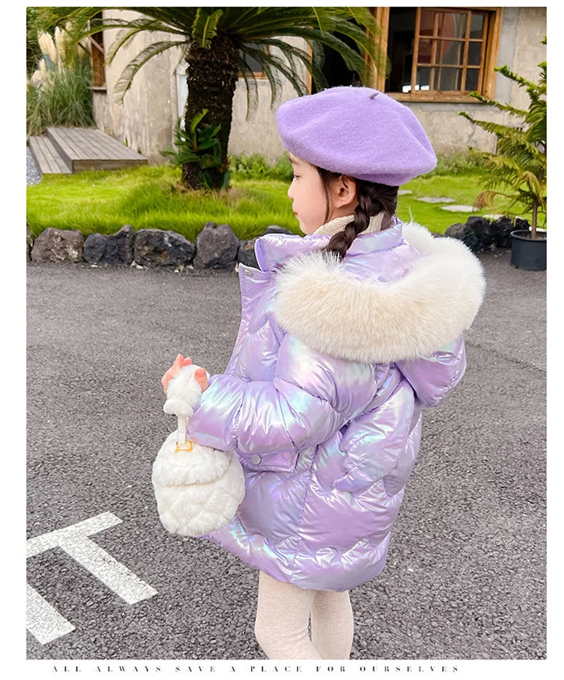 New Winter Coats Girls Warm Long Down Jackets Kids Fashion Unicorn Shiny Waterproof Parka Children Fur Collar Hooded Outerwear