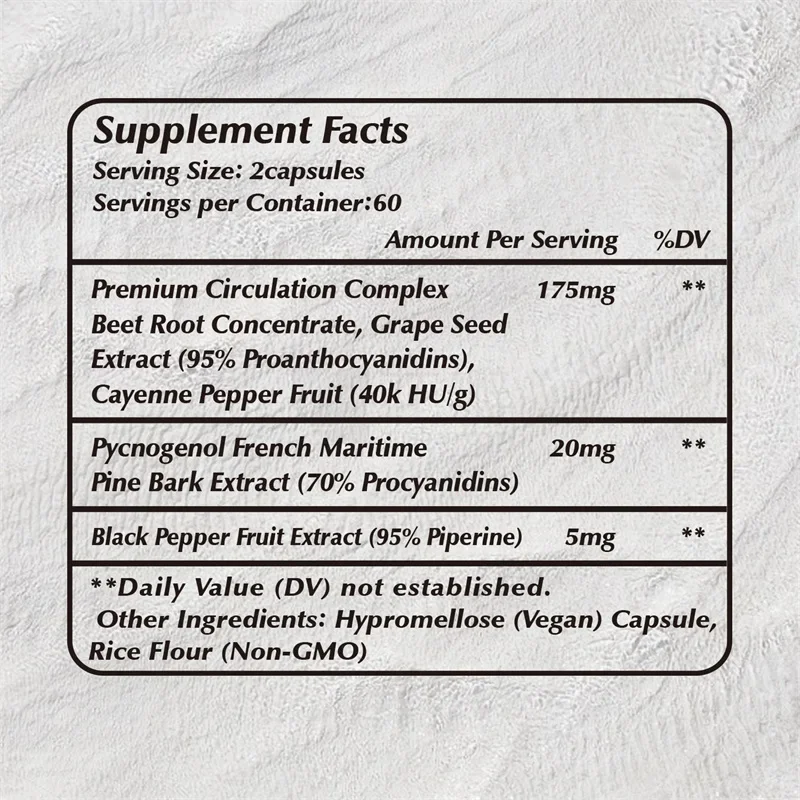 Premium Patented Pine Bark Extract - Our Pycnogenol capsules contain additional recycled Beet Root Concentrate, Cayenne Pepper, and Grapeseed Extracts. All of these ingredients are clinically proven to improve blood flow.