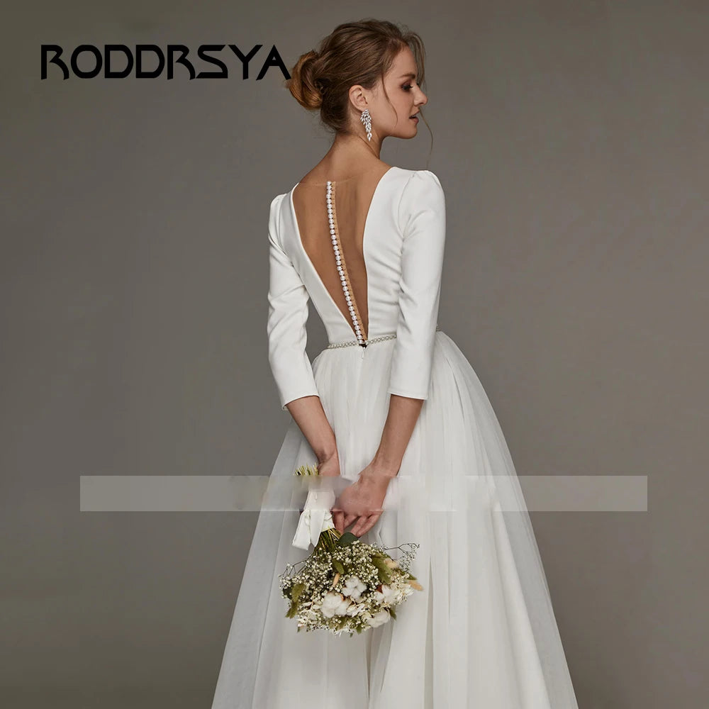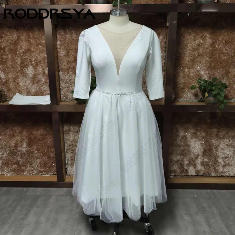 RODDRSYA Elegant Wedding Dresses For Bride Simple Ankle Length Bridal Gowns A-Line V-Neck 3/4 Sleeves Simple Short Robes Mariee