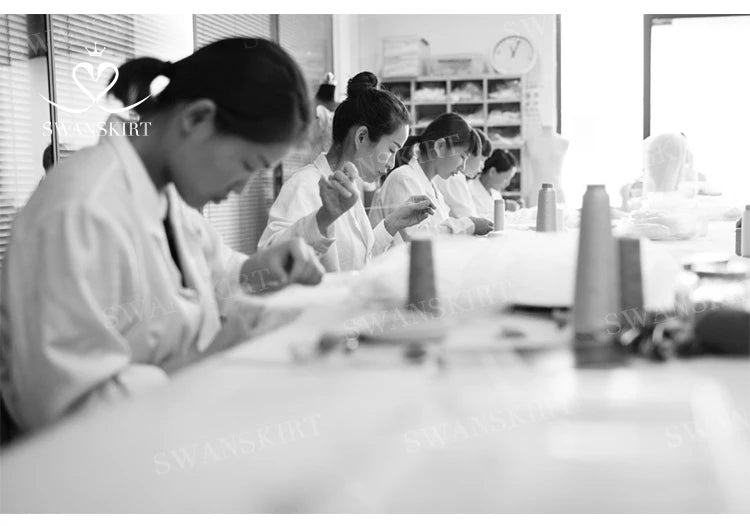 Professional dressmakers spend hours sewing on beads and pearls to perfect an elegant and classic design for you.