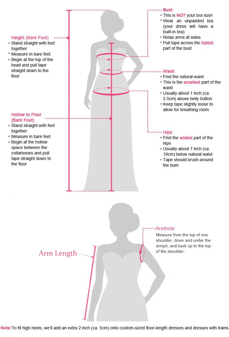 We not only make wedding dresses of standard size,but also offer you custom-made services.If you choose custom products,please provide us with your size parameters.(as shown in the figure below)