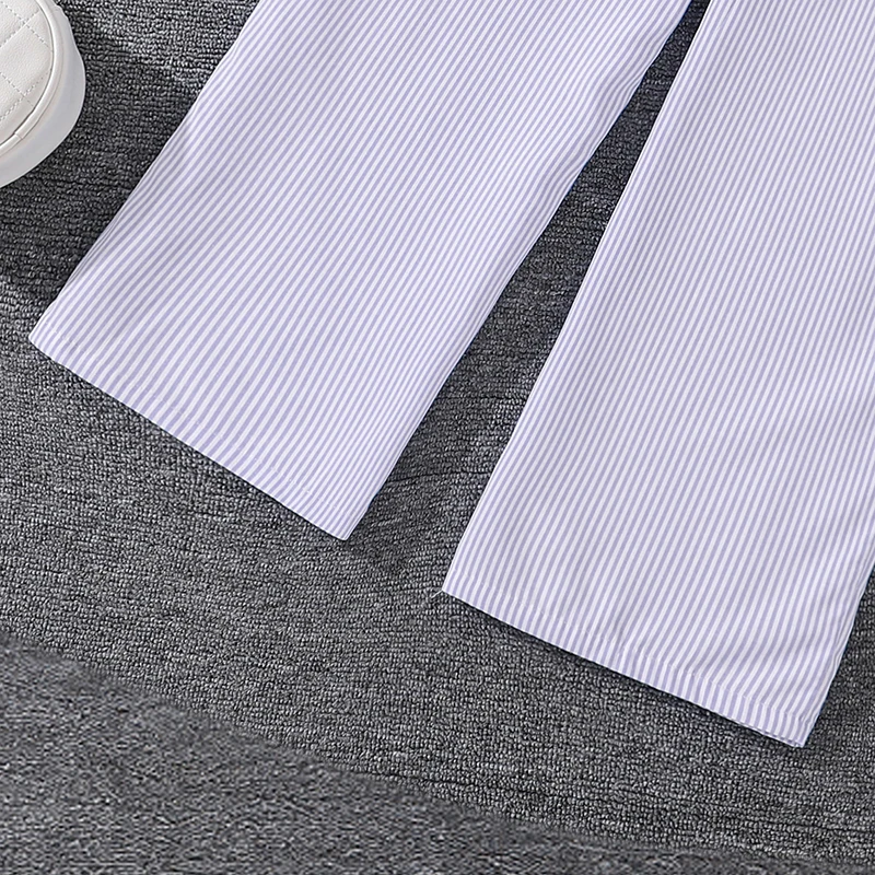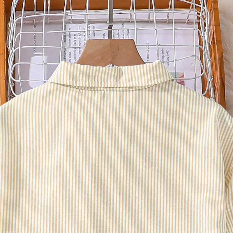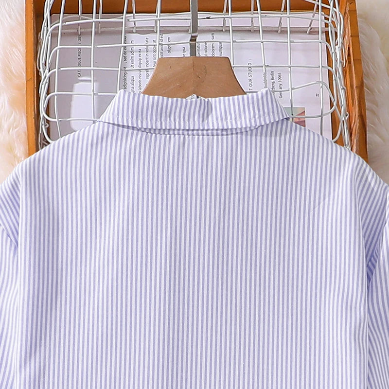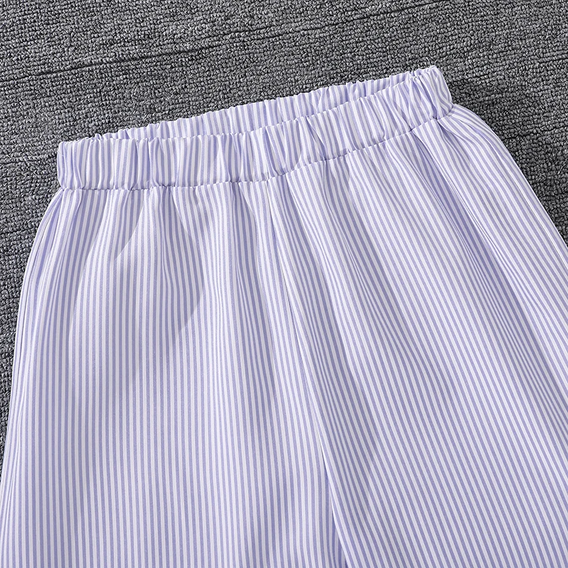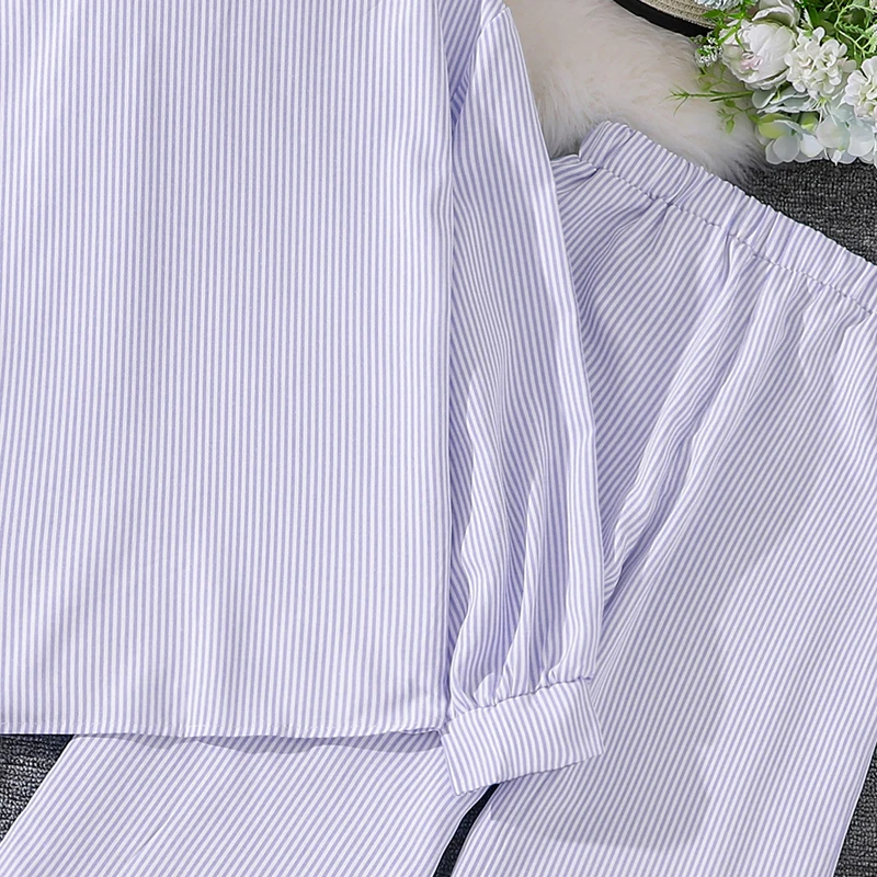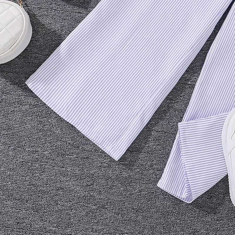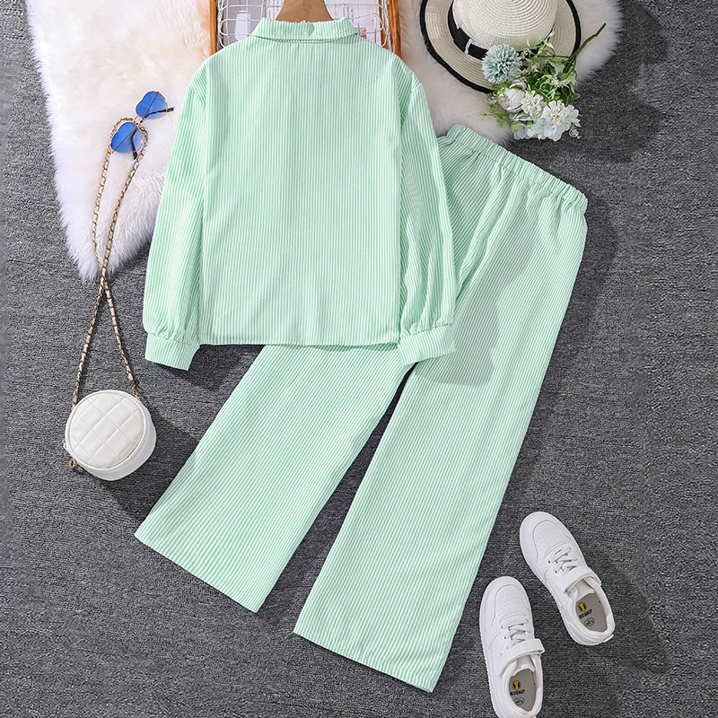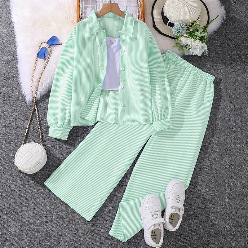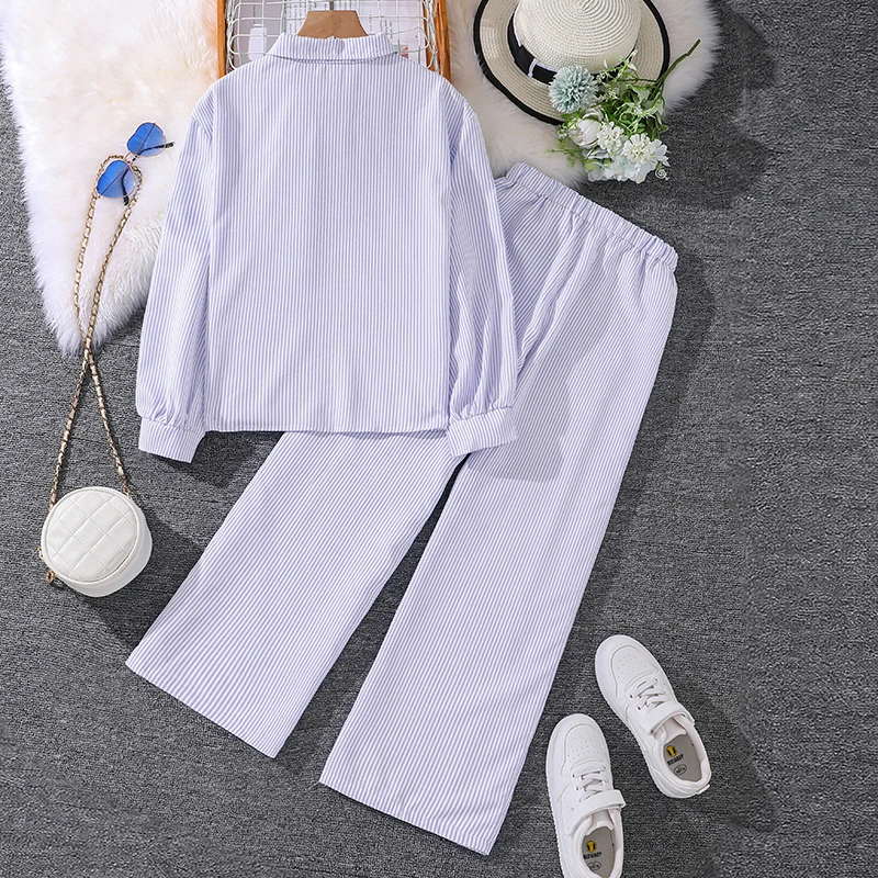 Spring Hot Sale Kids Outfit 4-12 Years Girls Striped Long Sleeve Chemise + Casual Loose Straight Leg Pants Shirt Suit 2Pcs Set